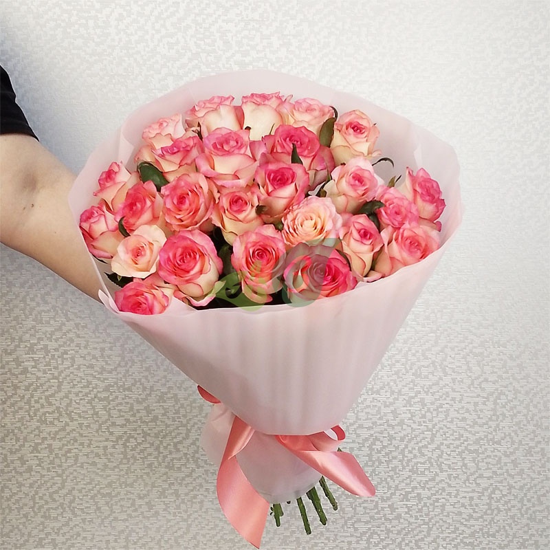 • Роза - 25 штук, цвет - бело-розовый, длина стебля - 60 см;