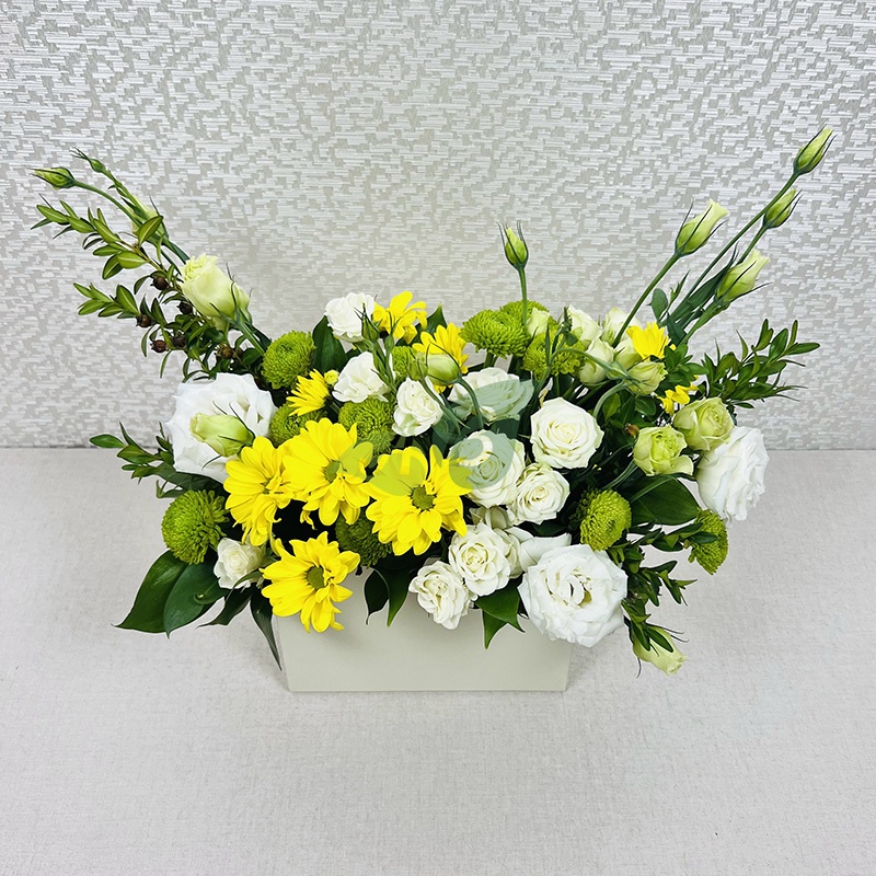 Облако кустовых роз и желтые хризантемы в коробке – такую прелесть можно заказать с доставкой в любой район Кудымкара.